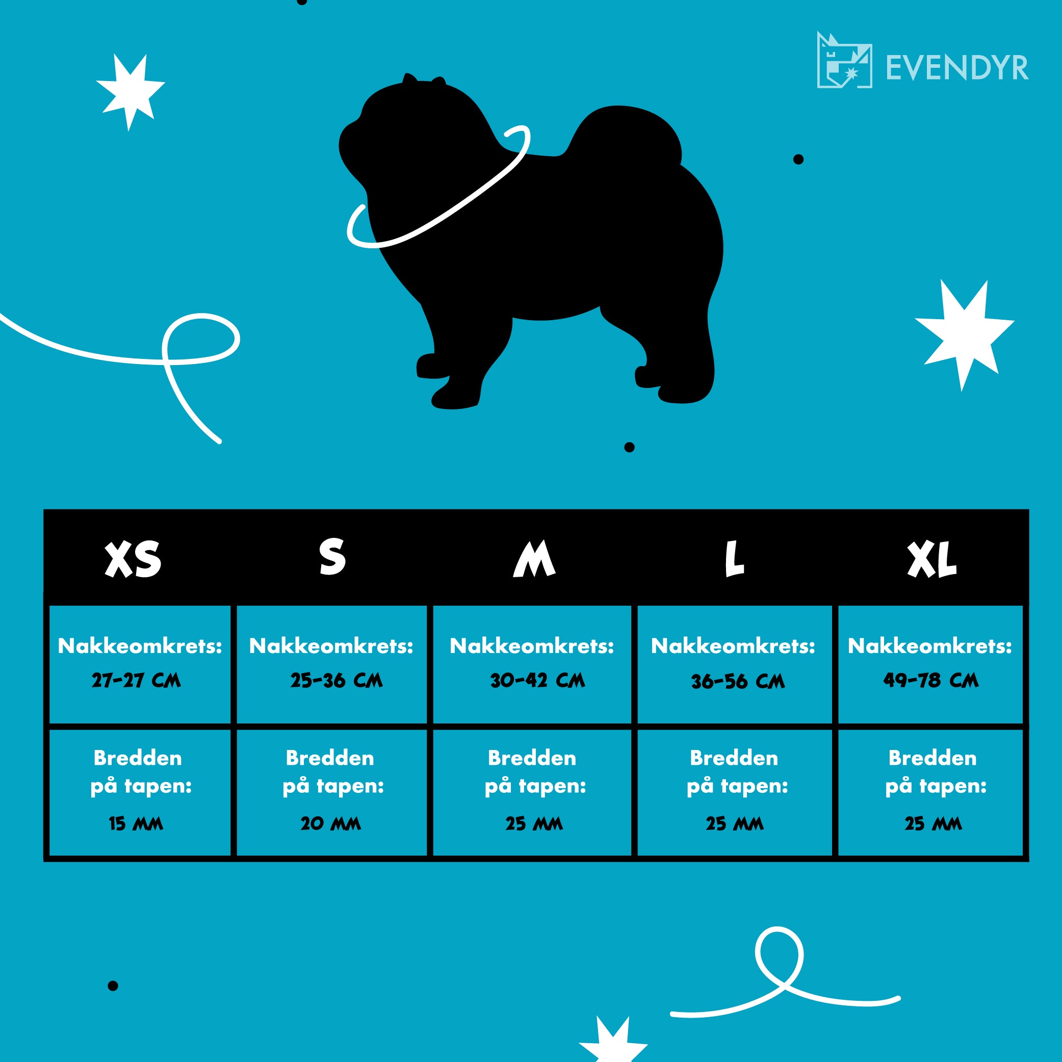 Hvis hunden din er mellom våre størrelser eller du vil at tilbehøret skal passe best for ham, skriv oss en melding: kontakt@evendyr.com. Vi kan hjelpe deg og sy tilbehør spesielt til din hund!