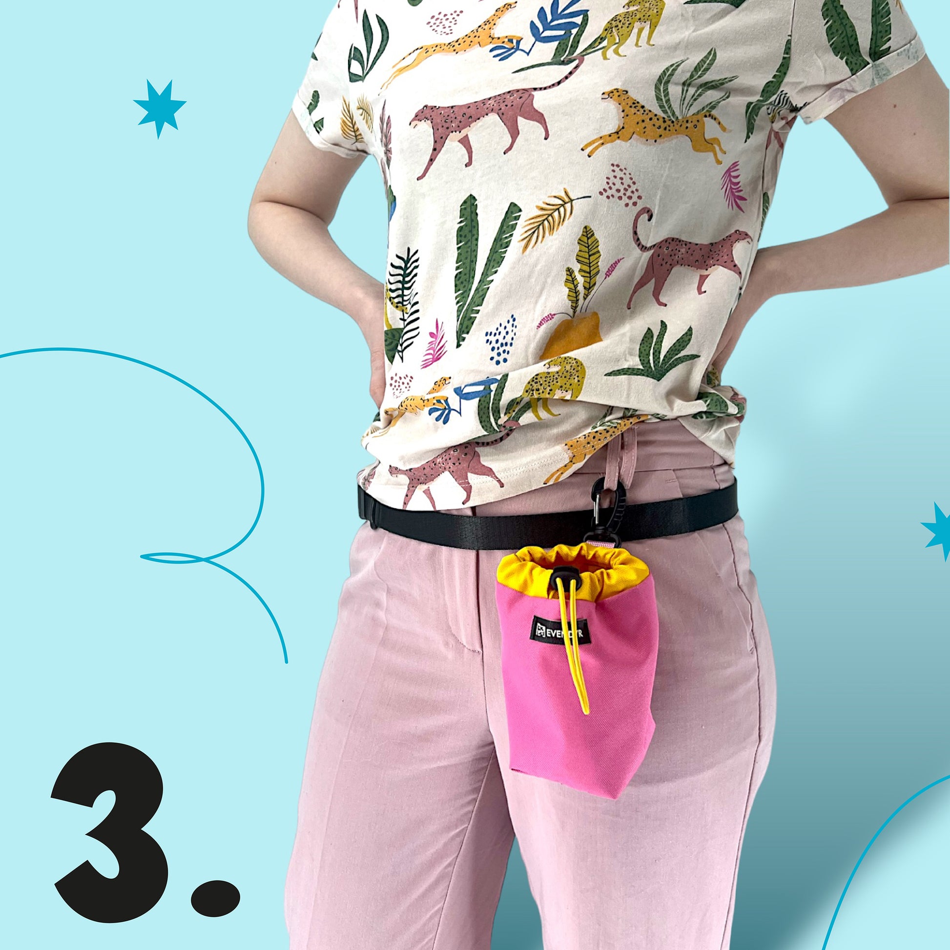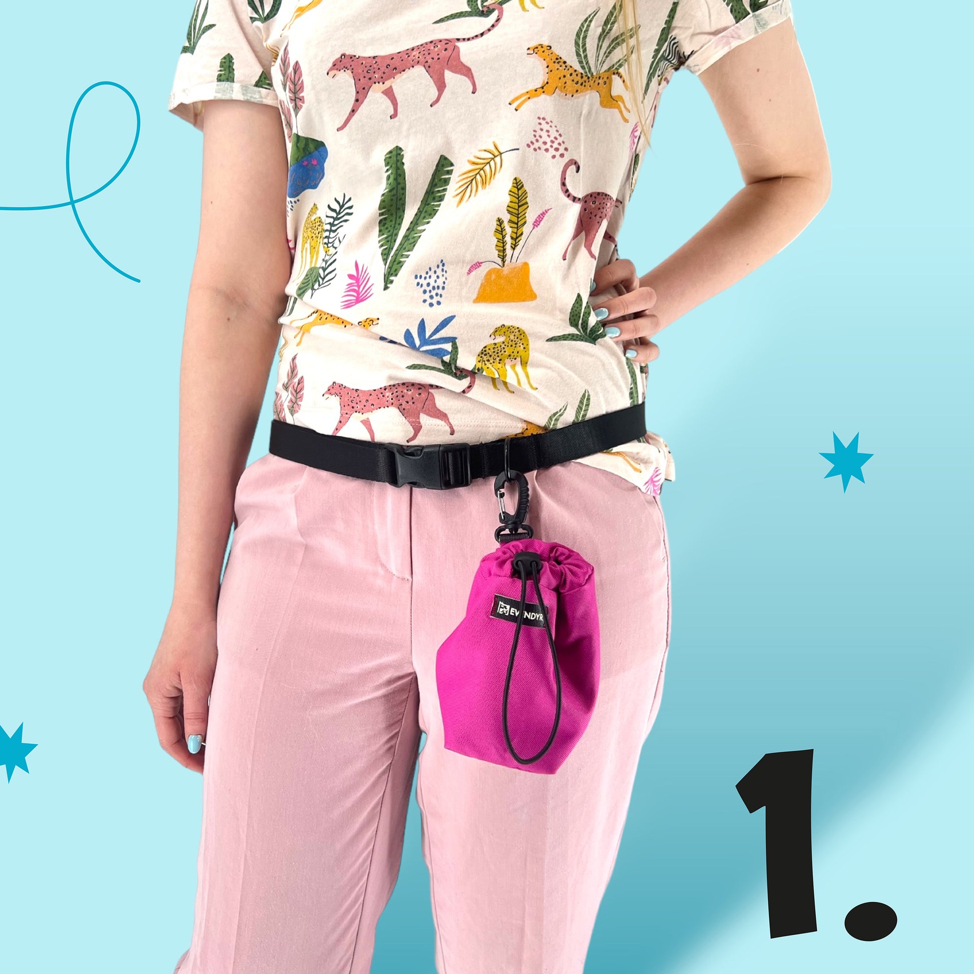 Du kan feste godbitvesken til for eksempel en bukse, bånd med D-ring eller sette den på belte med spenne og d-ring. Se på bildene nedenfor hvor mange måter du kan bruke den på!