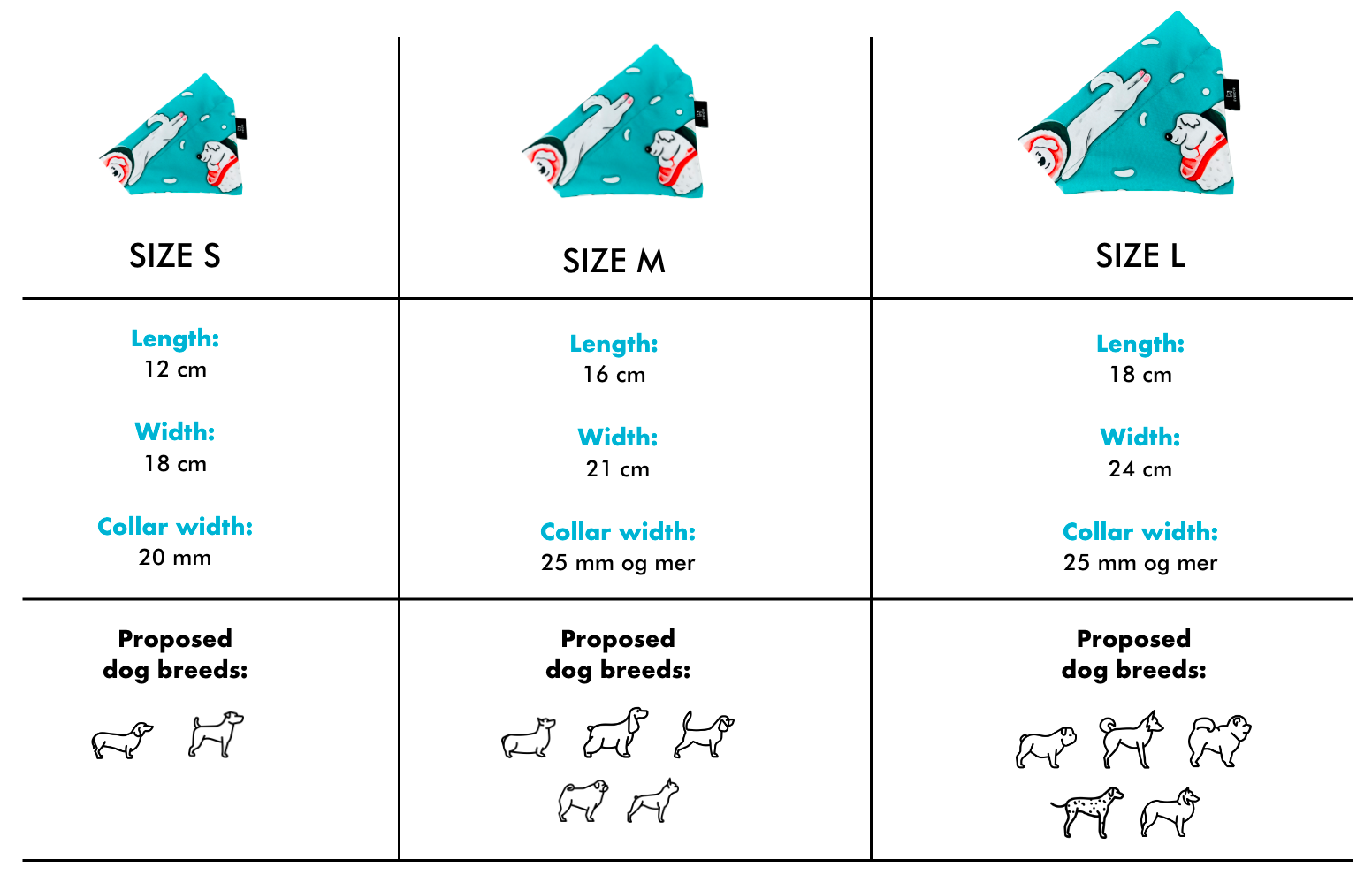 Produktet er laget av vanntett materiale av høy kvalitet. Bandanaen er tilgjengelig i tre størrelser - S, M og L. Husk! Hvis hunden din er mellom våre størrelser, skriv til oss så syr vi produktet i størrelse!
