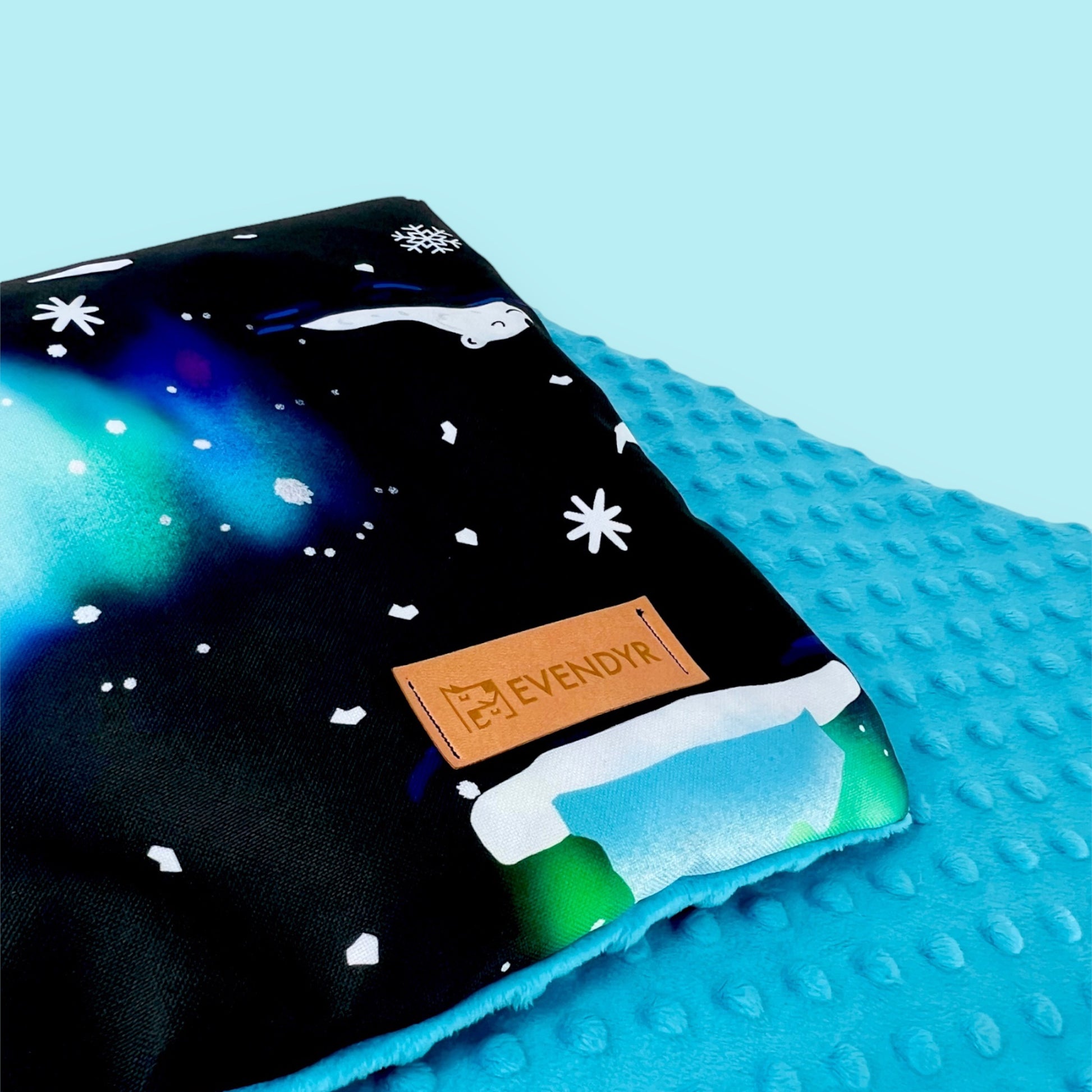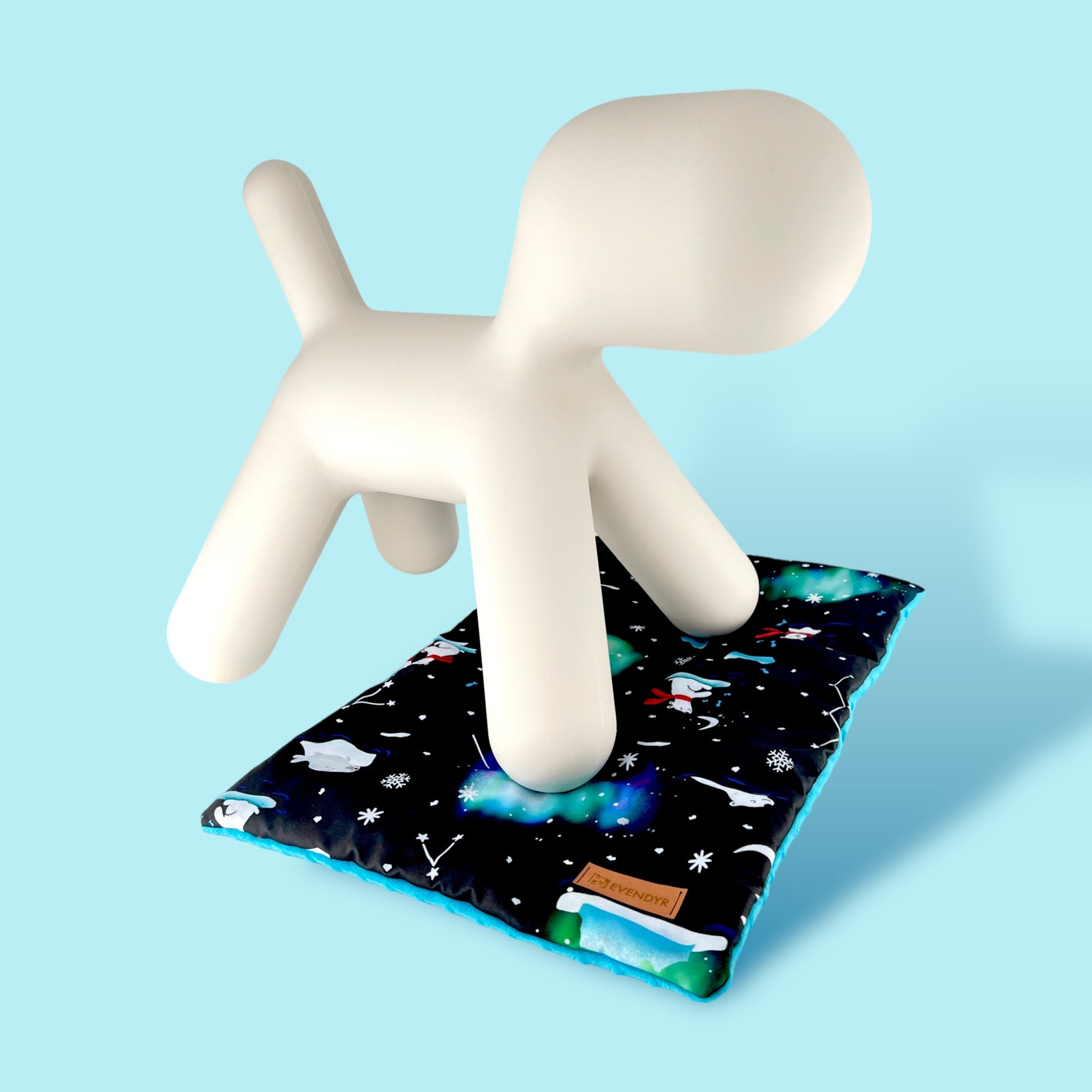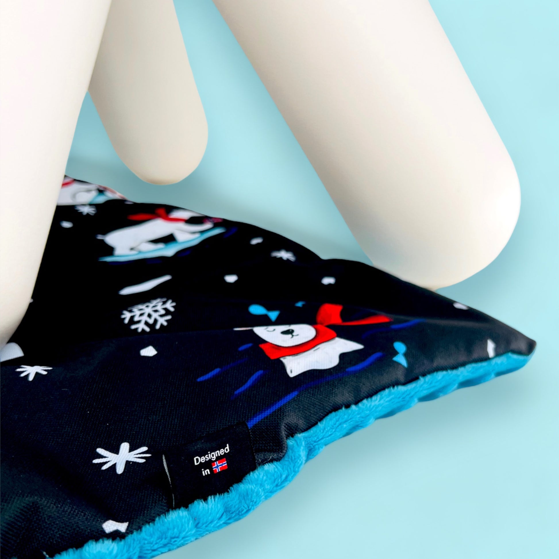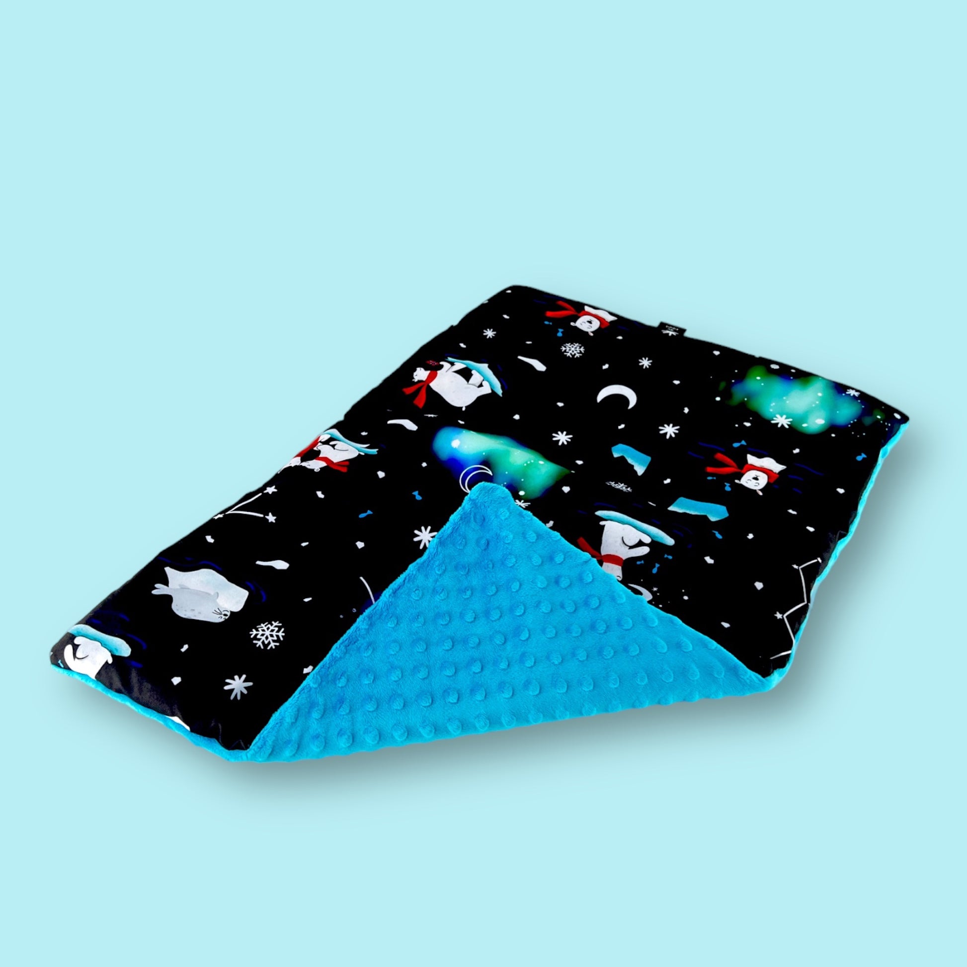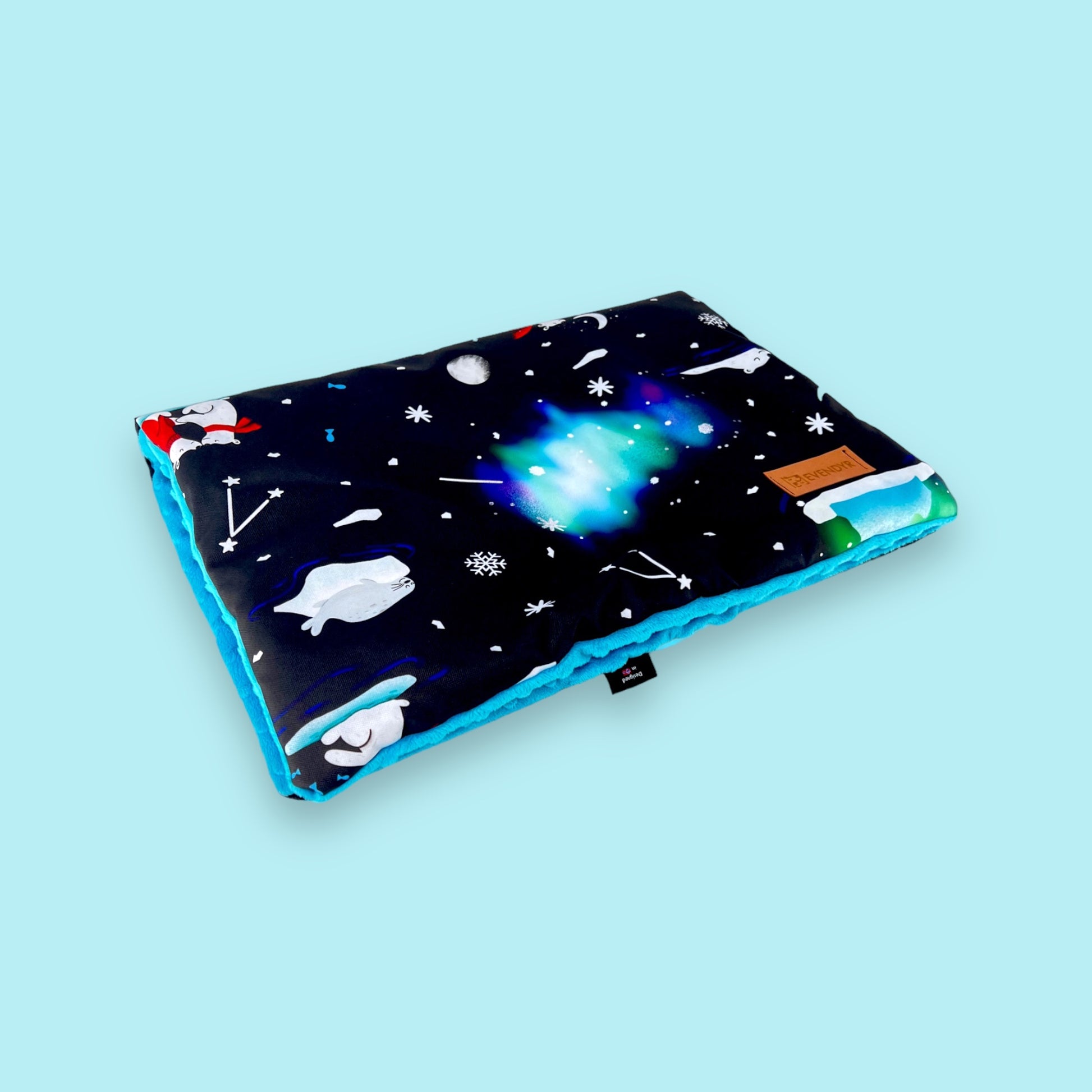 The top of the mat is a beautiful „Aurora PolarBears" pattern, one of our bestsellers. It is made of waterproof polyester that is easy to clean and does not "catch" dirt like other popular fabrics used for the production of dog beds. The bottom is made of soft and warm turquoise minky fabric.