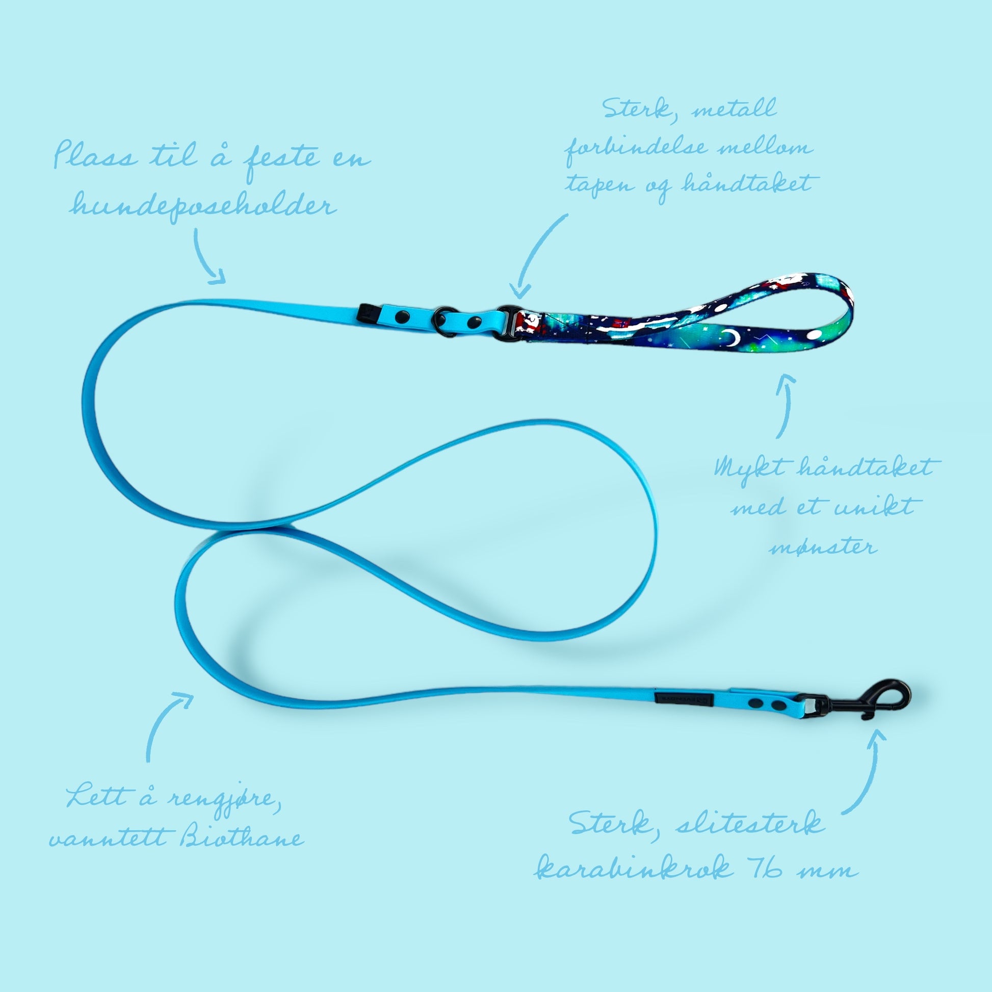 Håndtaket er laget av en sterk tape med et originalt, fargerikt trykk som gir båndet stil og design og lar kjæledyret ditt skille seg ut fra hundekompisene på hver tur.
