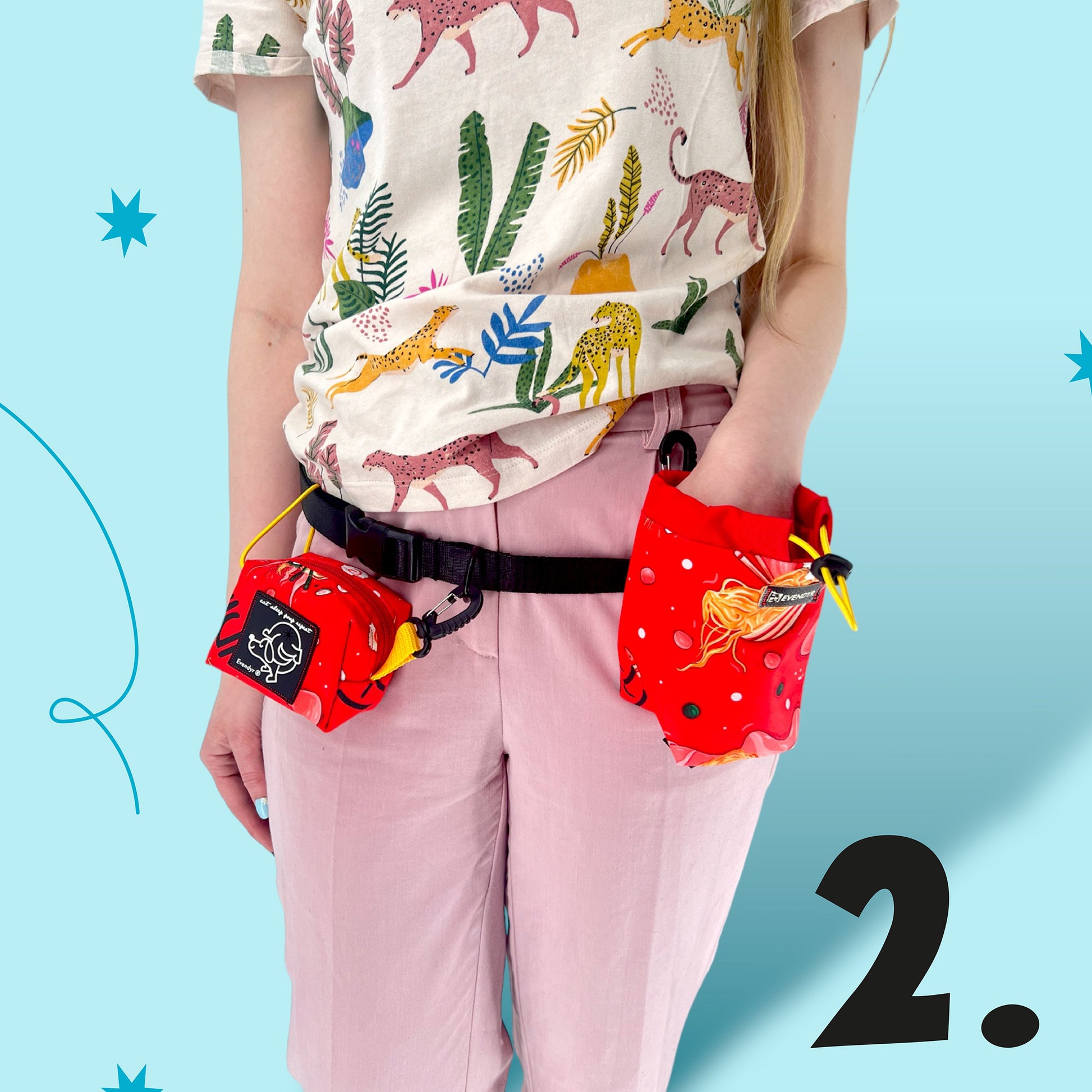 Du kan feste godbitvesken til for eksempel en bukse, bånd med D-ring eller sette den på belte med spenne og d-ring. Se på bildene nedenfor hvor mange måter du kan bruke den på!