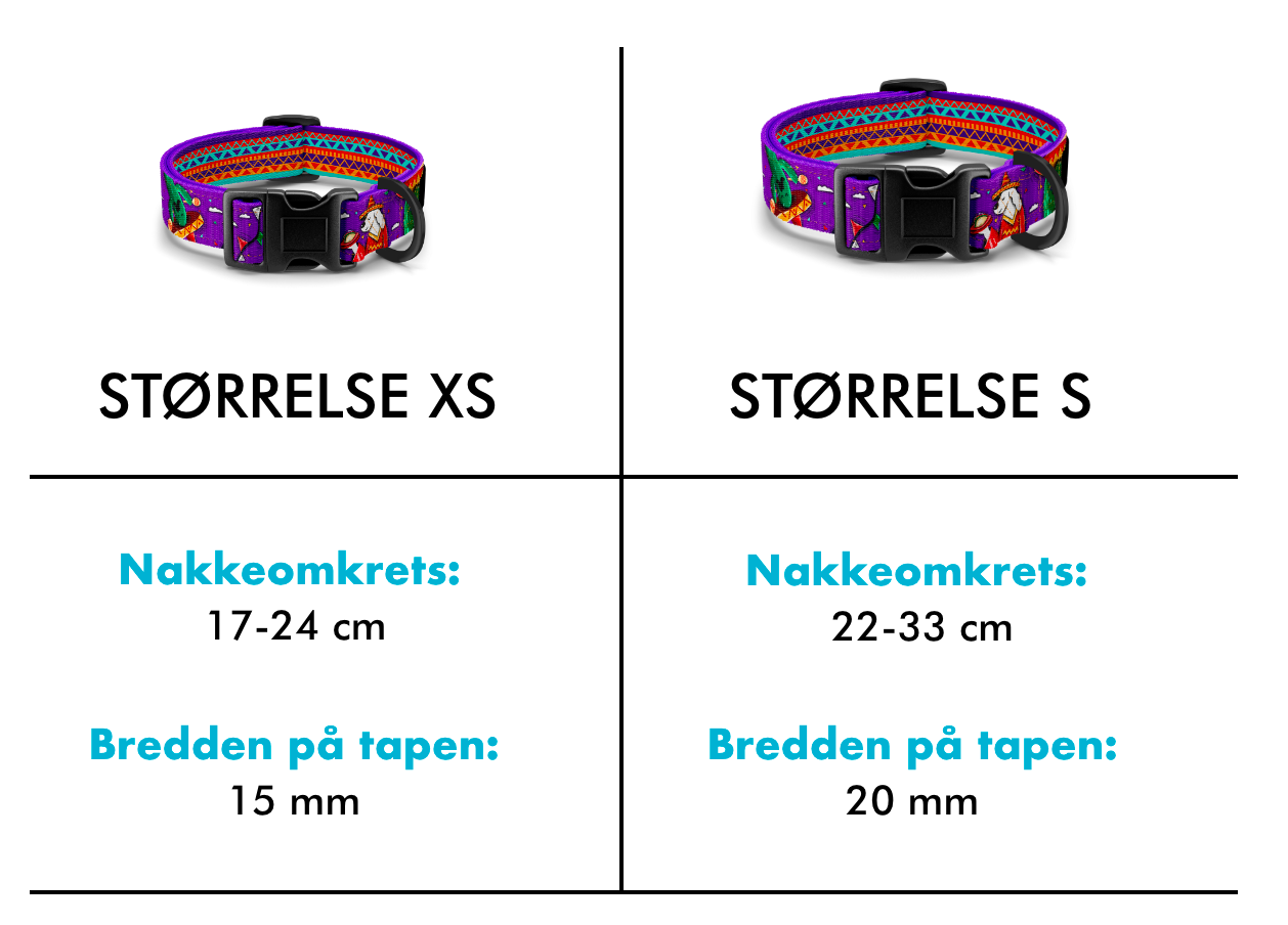 Halsbåndet finnes i 2 størrelser: XS eller S. Du kan også velge mellom to bredder 15 mm og 20 mm. Husk, hvis katten din er mellom størrelsene våre, skriv til oss! Vi kan sy et halsbåndet spesielt til katten din!