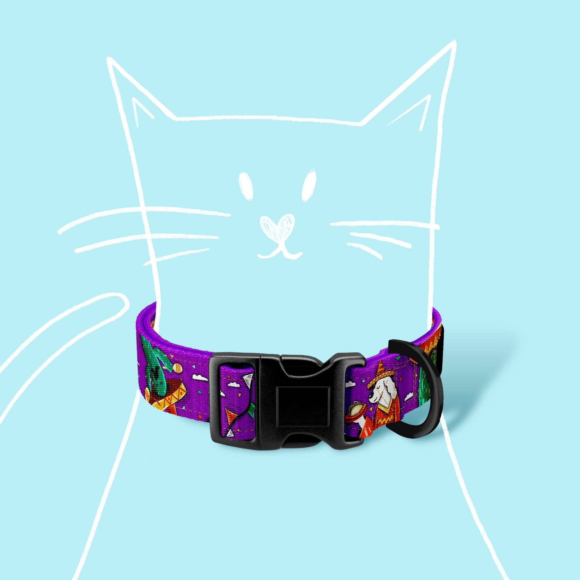 Et halsbånd med spenne er en klassisk modell av et kattehalsbånd. Laget av myk tape med et originalt mønster (tegnet av oss!), og med beslag valgt for ikke å belaste dyret, sikrer det kjæledyrets komfort og sikkerhet. Den har en plass til ID brikke (rett ved siden av logoen vår), som vil gjøre det lettere å identifisere kattungen hvis den blir borte.