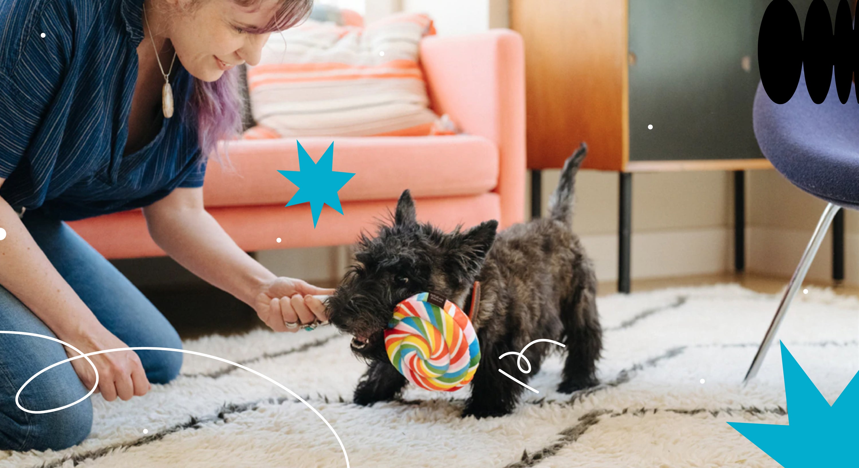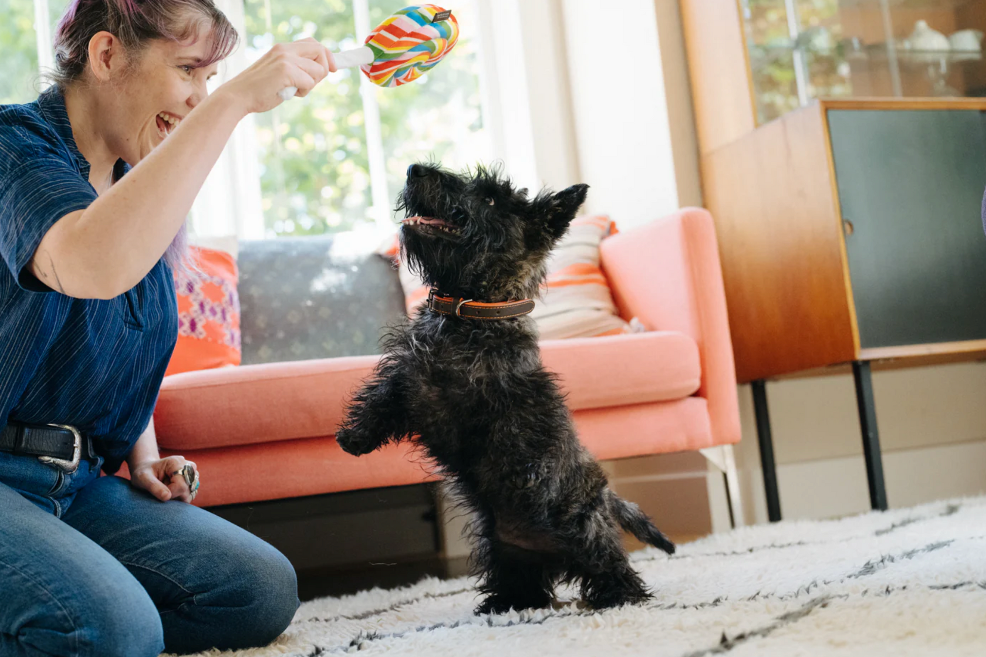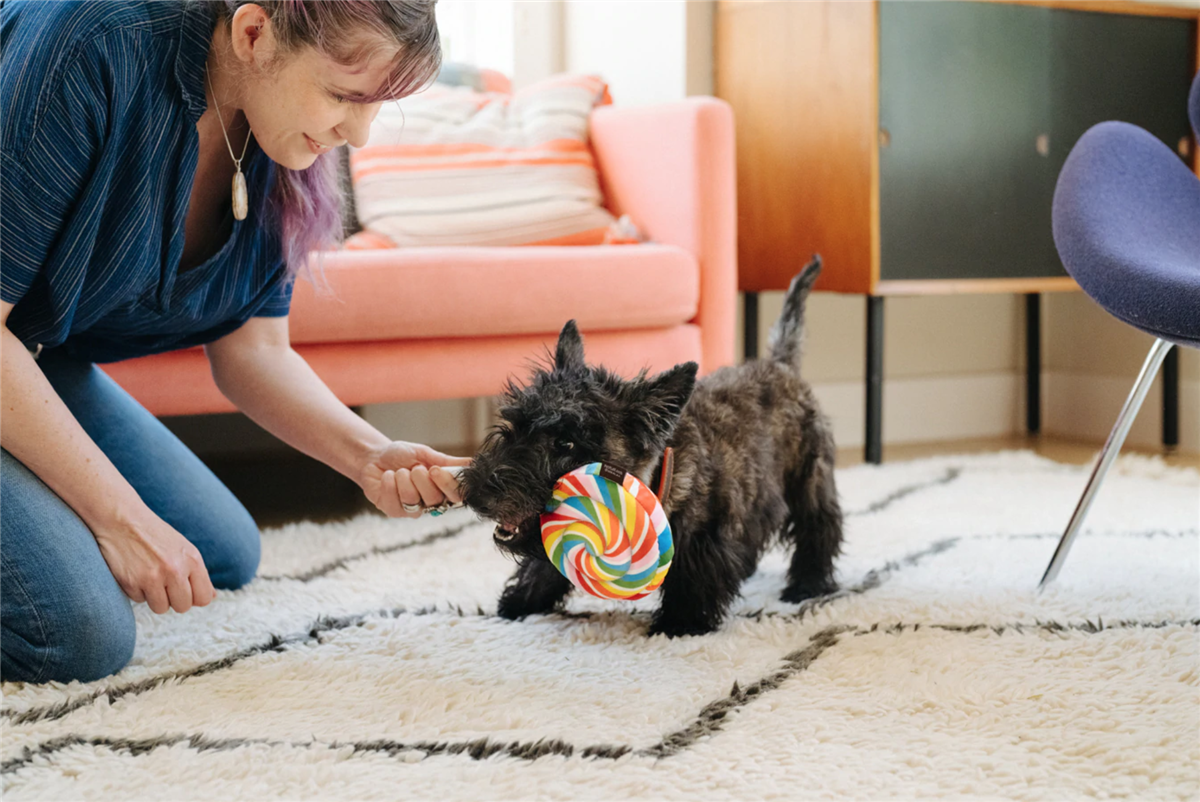 Snack Attack Lollipup-leketøyet fra p.l.a.y. er en regnbue slikkepinne med tau i pinnen, og stor squeaker som gir minimalt med stuffing. Gi kjæledyret ditt glede og unik moro!