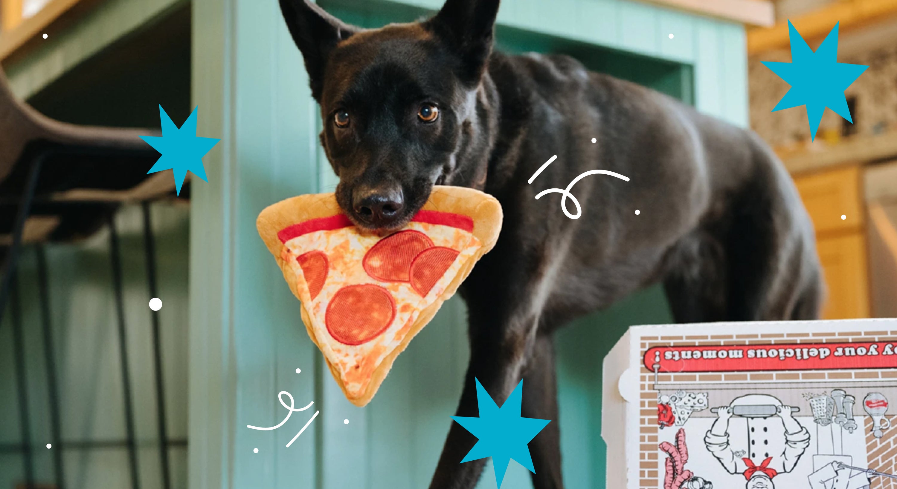 Gi hunden din en godbit fra Snack Attack Puppy-roni Pizza-kolleksjonen fra P.L.A.Y.! Dette gledesstykket har tre squeakers og en snor fra en T-skjorte gjemt i deigen for å etterligne kakens tekstur. Moro og halelogring garantert!